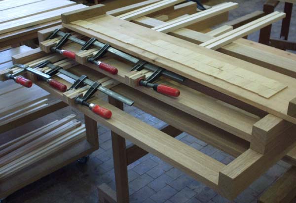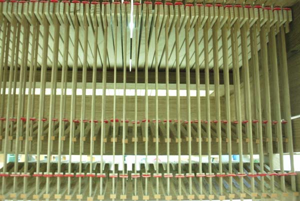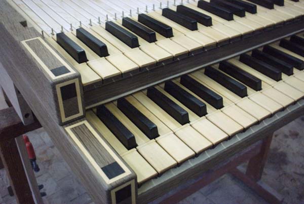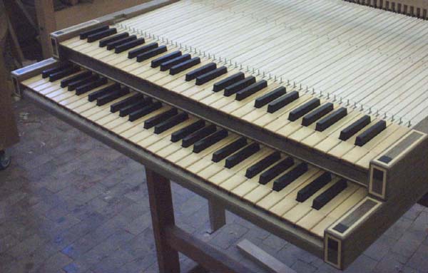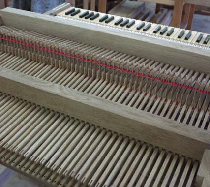 Spieltisch mit Mechanikteilen im Orgelinneren.