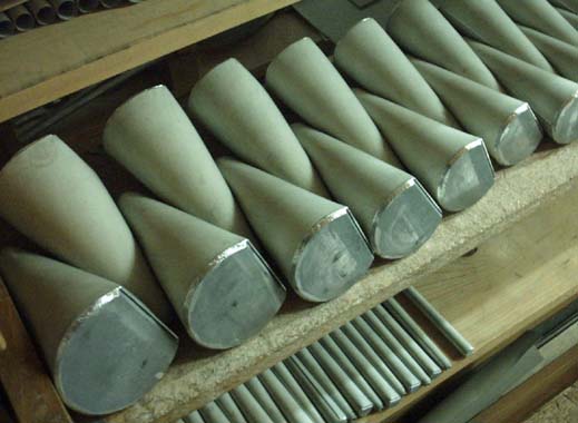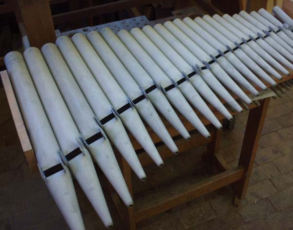 Die Pfeifenkörper und Pfeifenfüße werden zusammengesetzt: Fertig ist die Quintade 8'.