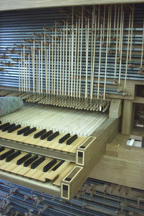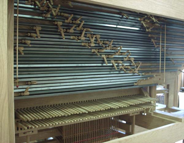 Holzleisten), die die Tasten mit den Ventilen verbinden.